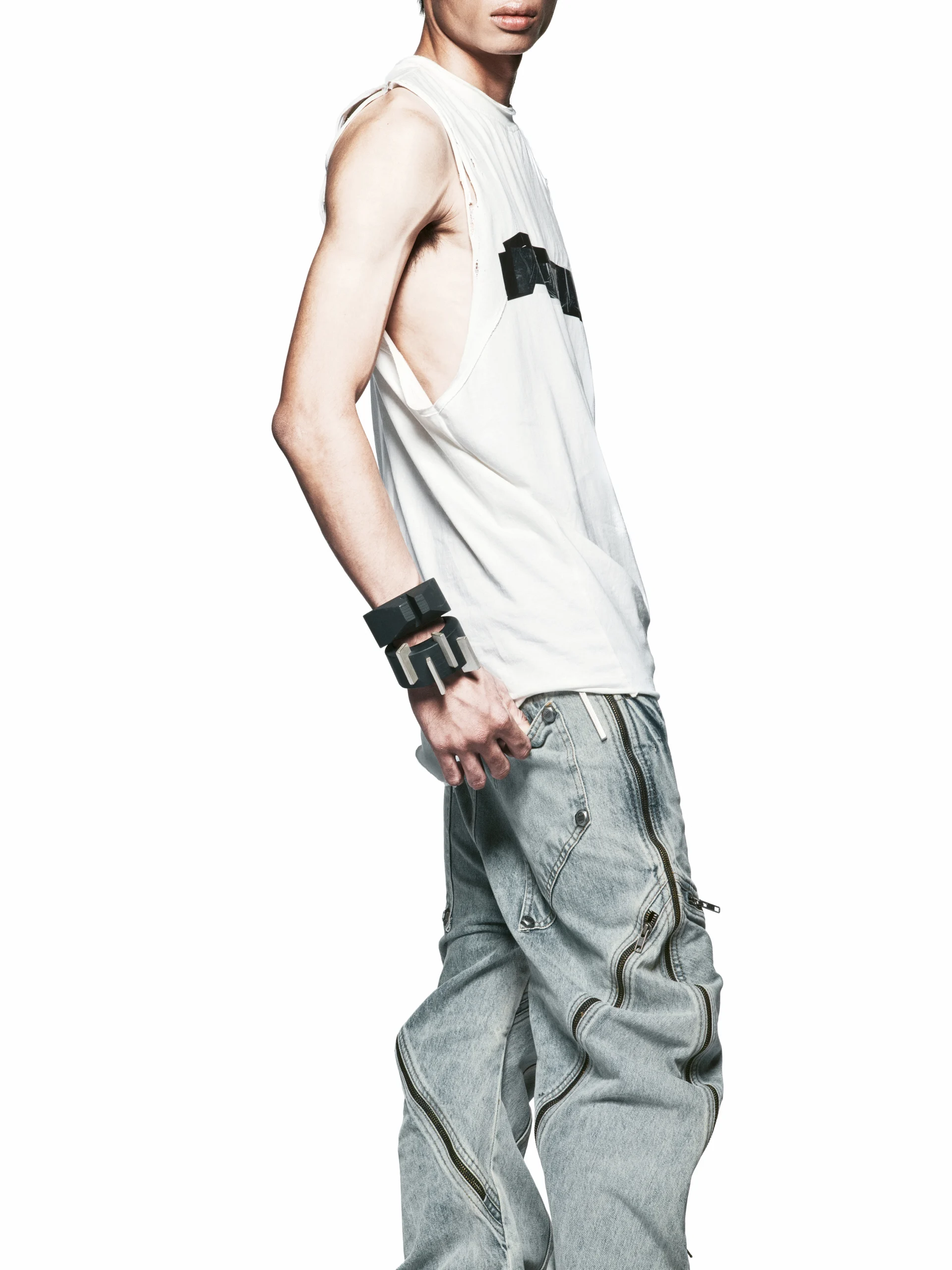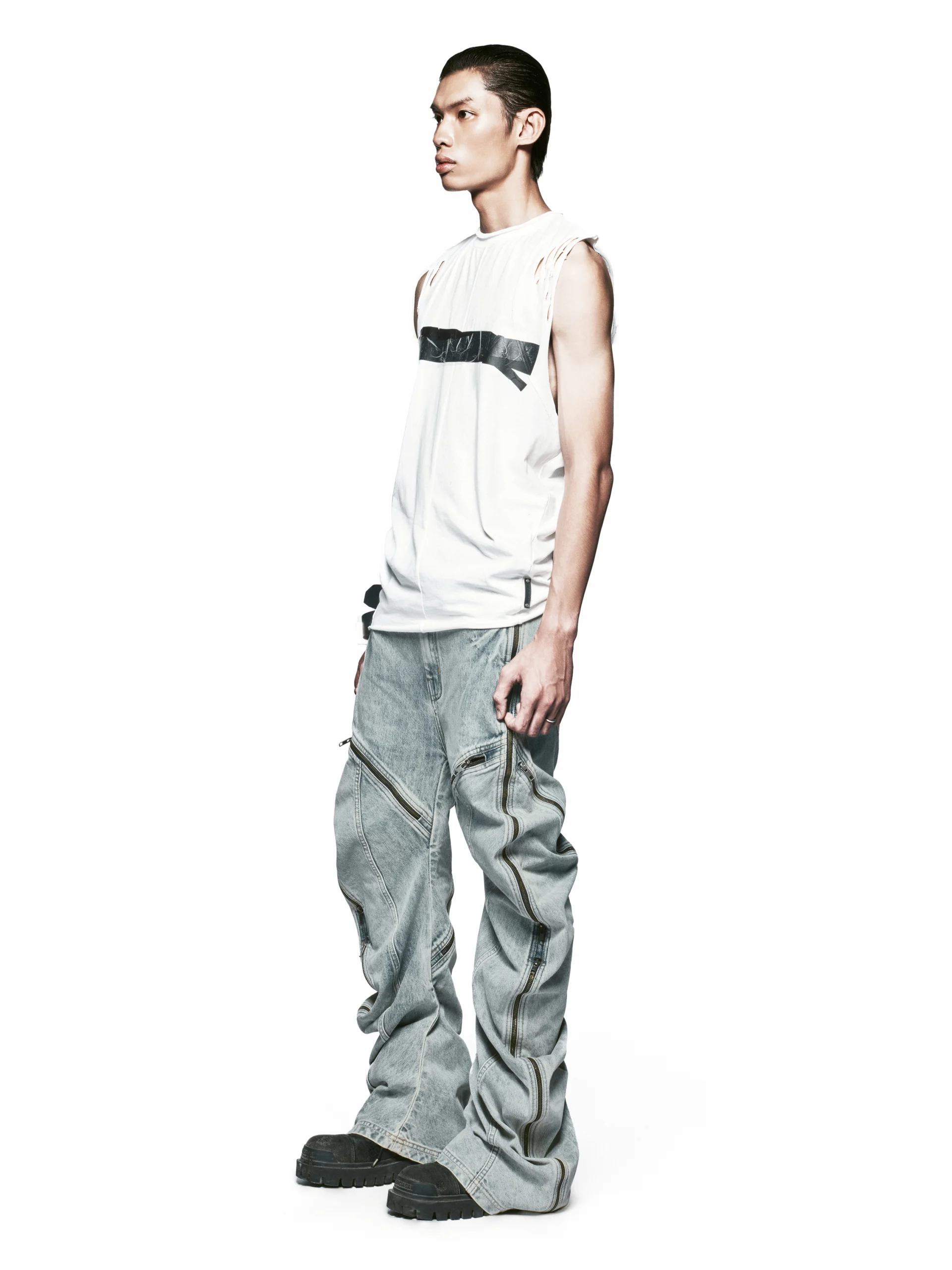 – Low-rise zip-detail, curved-leg jeans